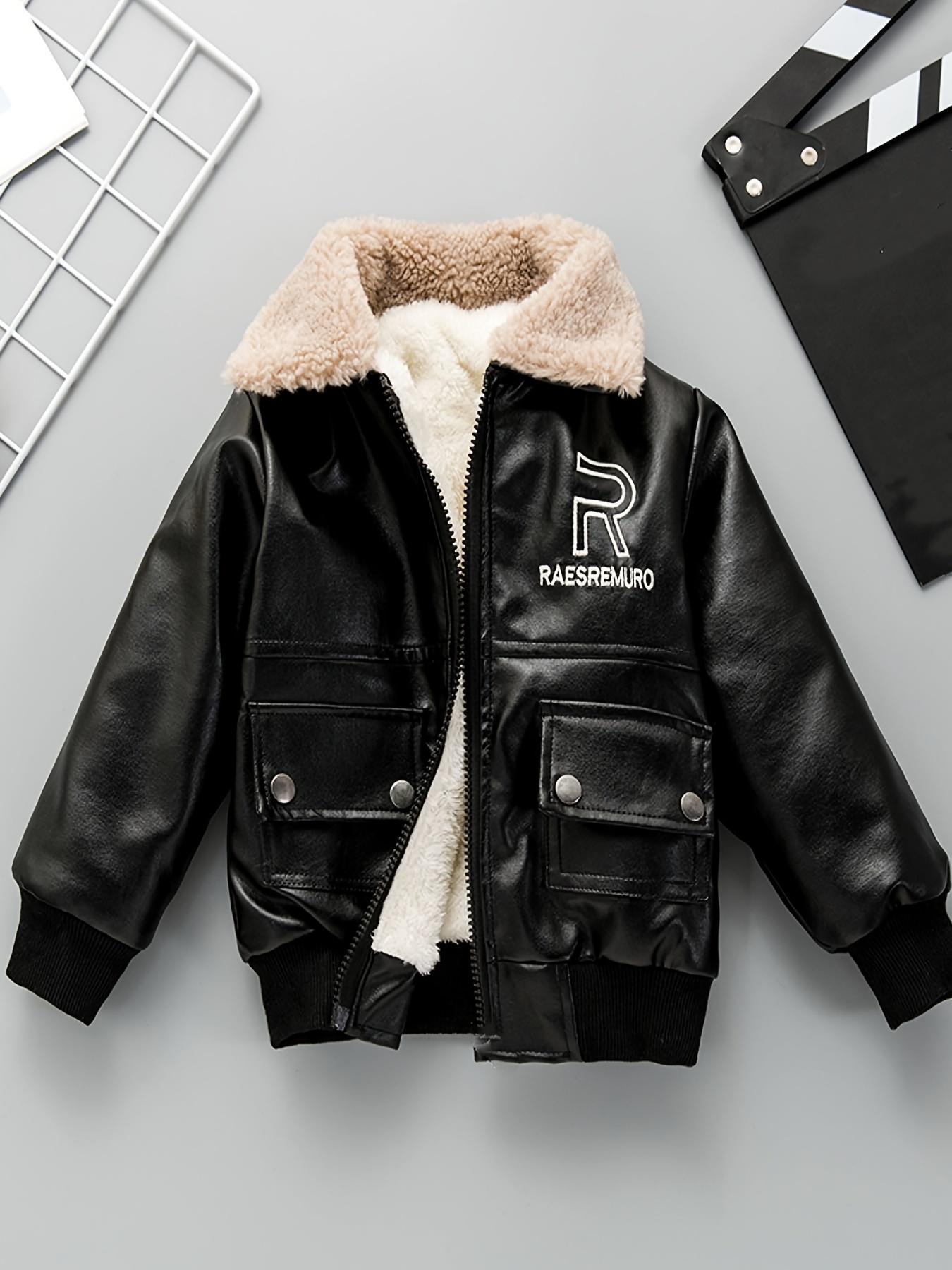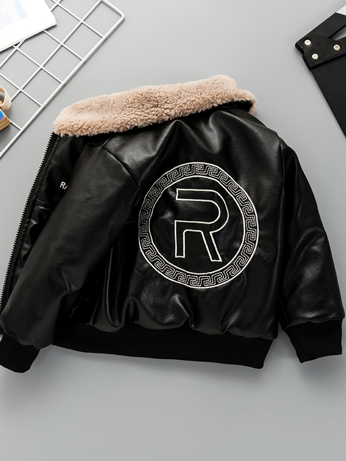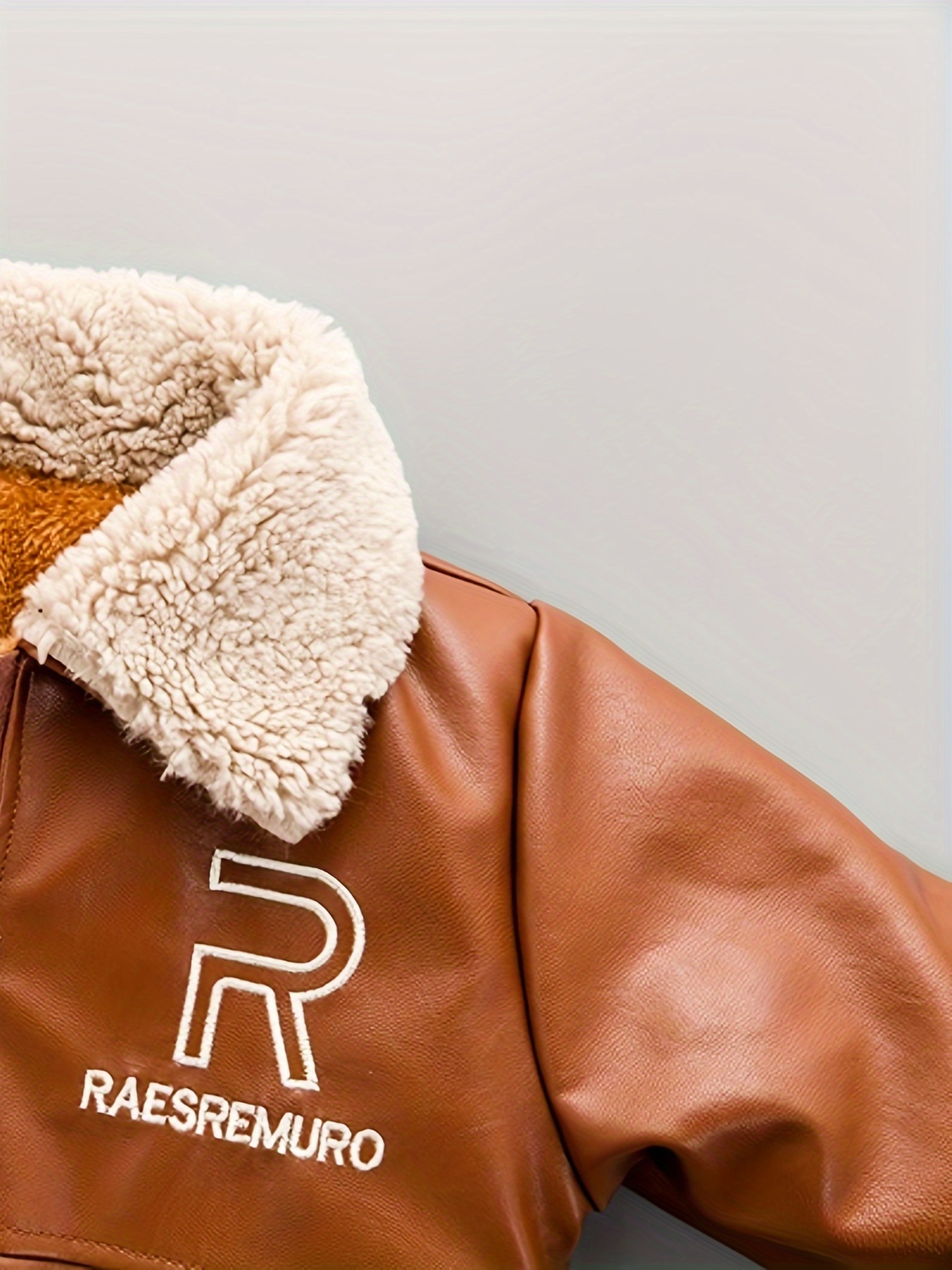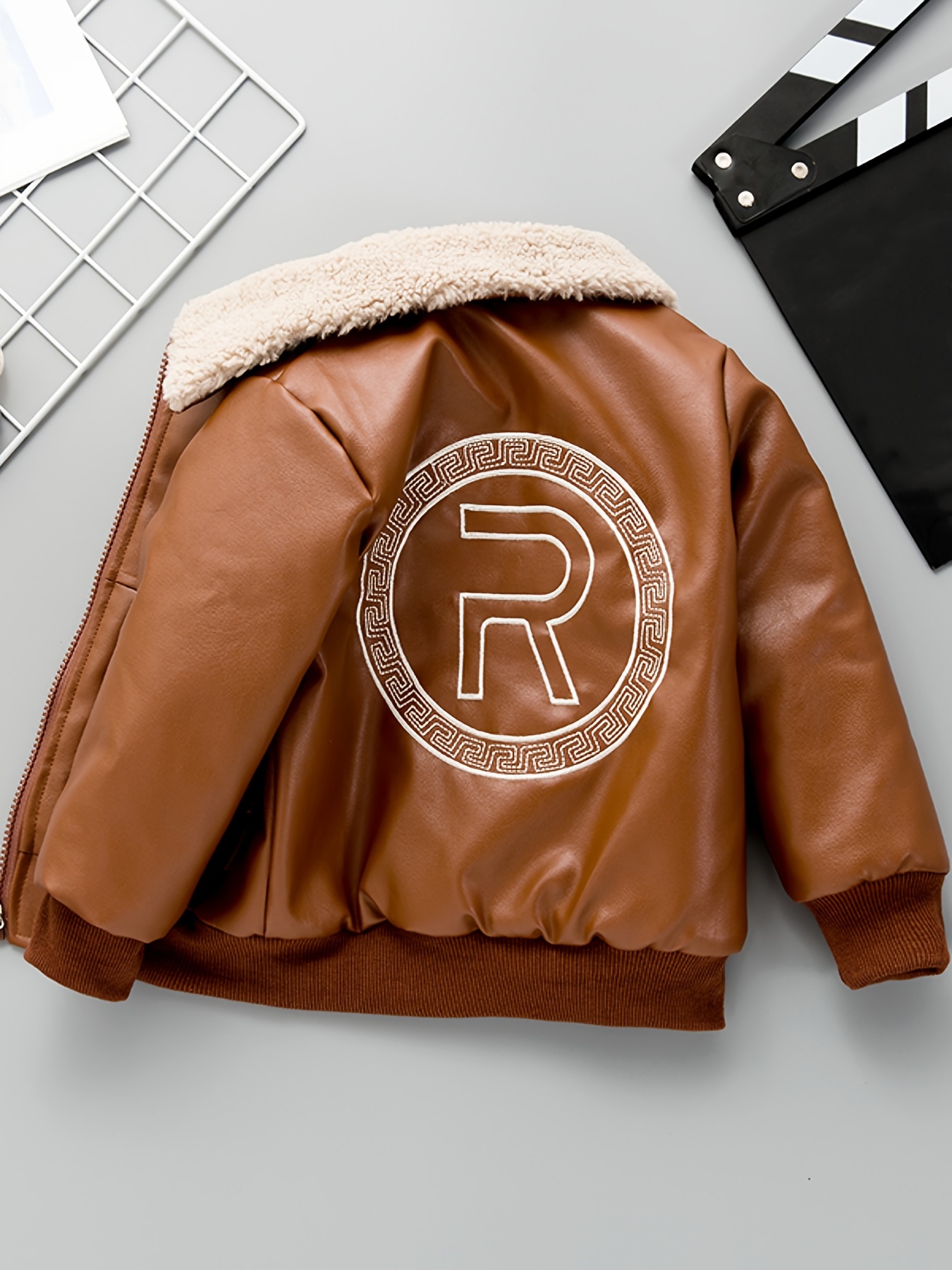 ‘ PU Fleece Jacket Winter Warm Zip-Up Coat with Collar & Embellished Letter ” Emblem – Hand Washable Cold-Weather Outerwear for, Playdates (Regular Fit, Zipper Closure) | for