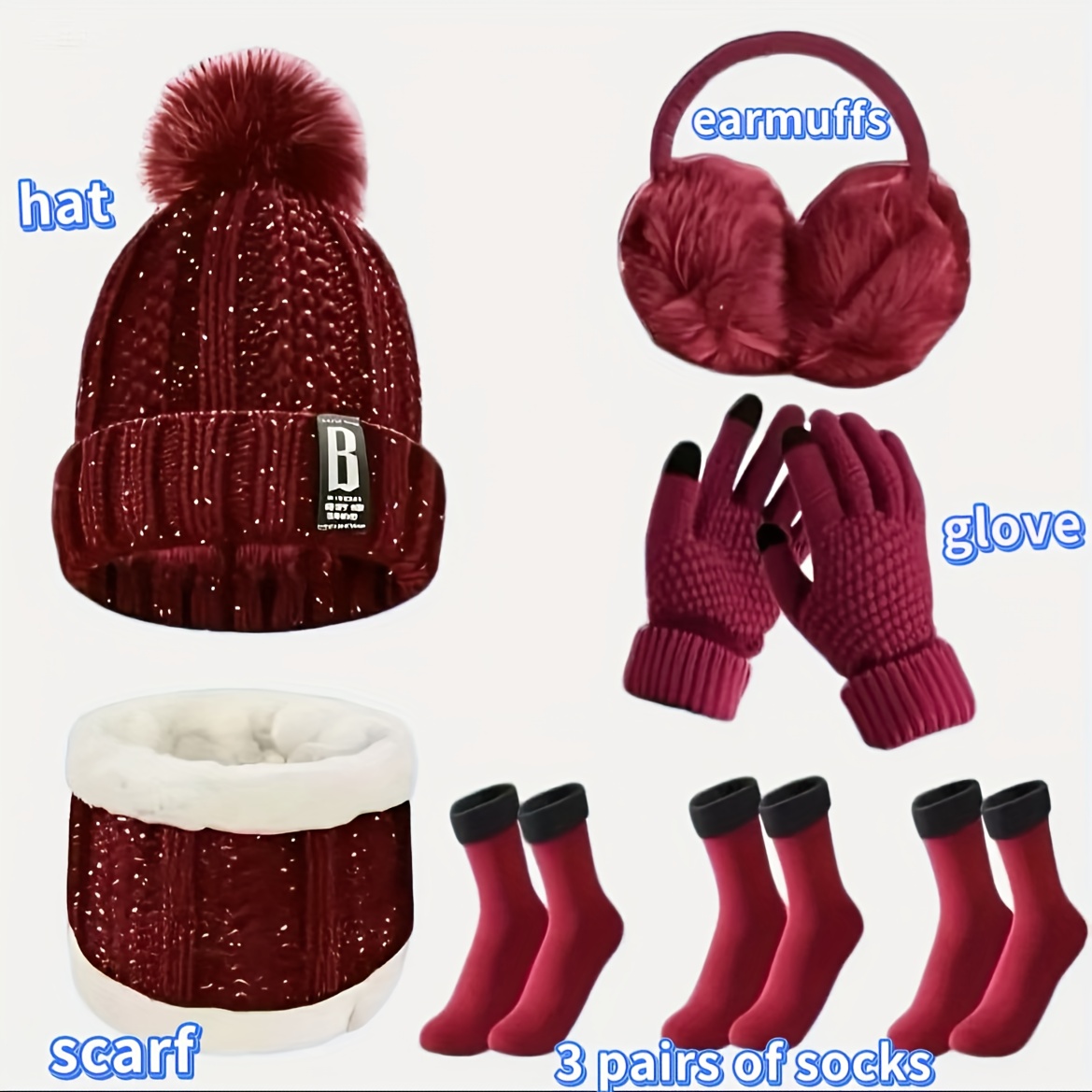 Winter Sports Set , Thick Warm Knit Beanie Gloves Ear Muffs & Snow Socks , Soft Stretchy Pullover for Men & Women , 7pcs , Red , Outdoor Skiing Cycling Hiking Gear , Solid Color Design Durable Outdoor Wear