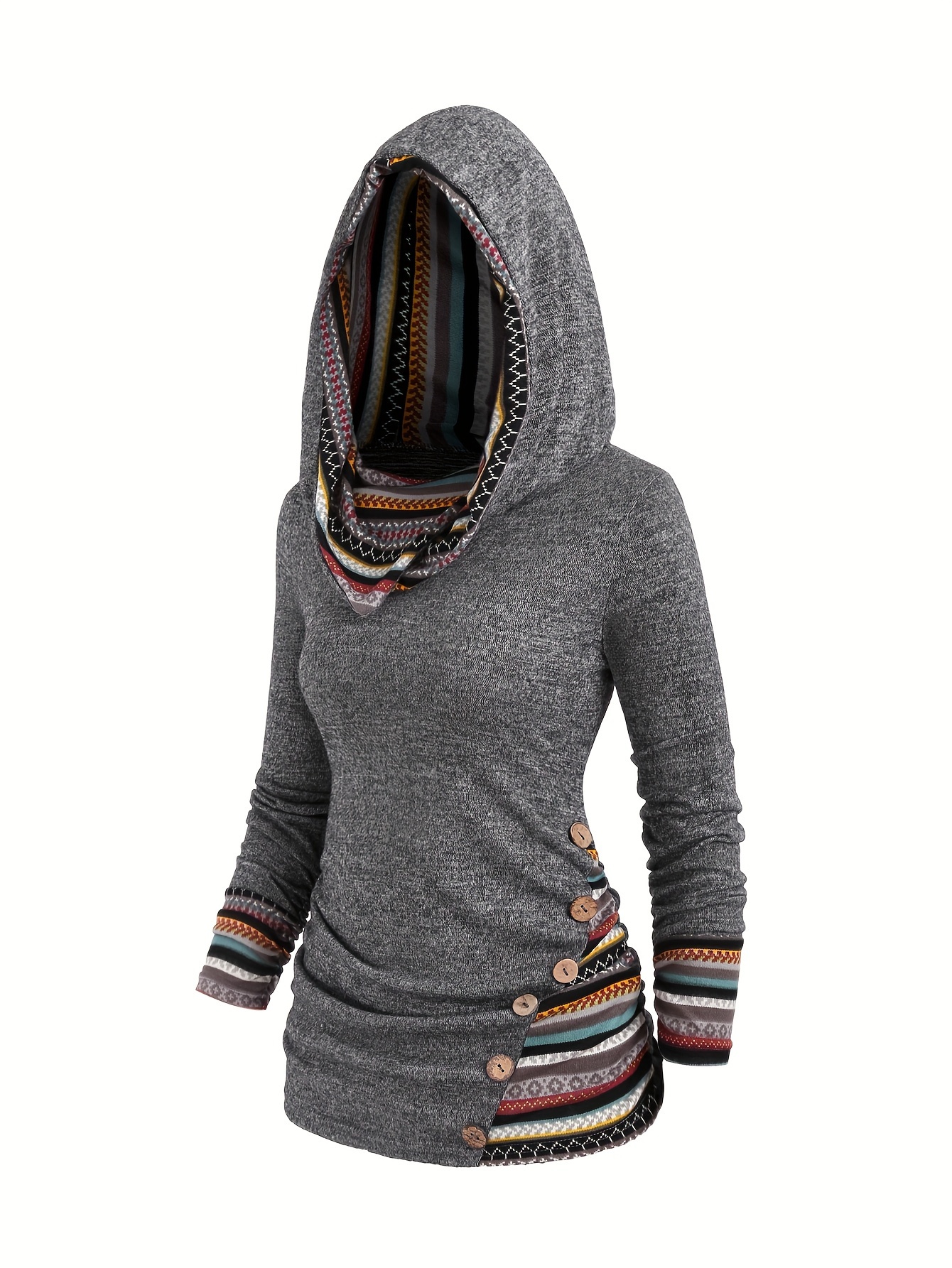 Women’S Fashion Hooded Sweatshirt, Long Sleeve Striped Patchwork Knit with Faux Buttons, Polyester 95% Spandex 5%, Fall/Winter Season, 180g/m² Fabric Weight