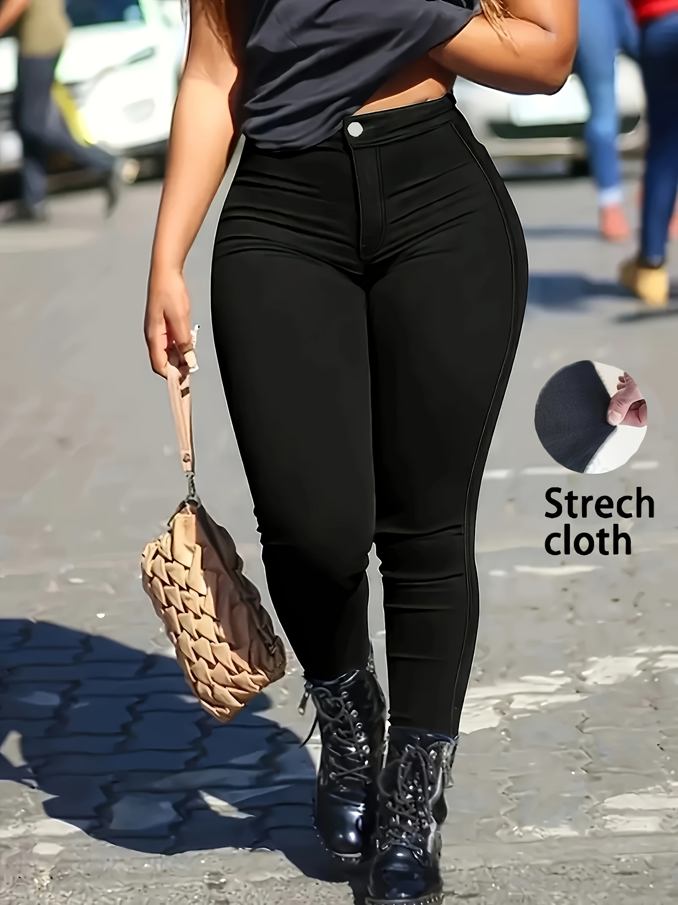 Women’s High-Waisted Stretch Skinny Jeans – Elegant Solid Black Straight-Leg Long Pants with Button Closure & Built-In Zipper, All-Season Comfort for Mature Women, Casual to Formal Wear (Hand Washable)