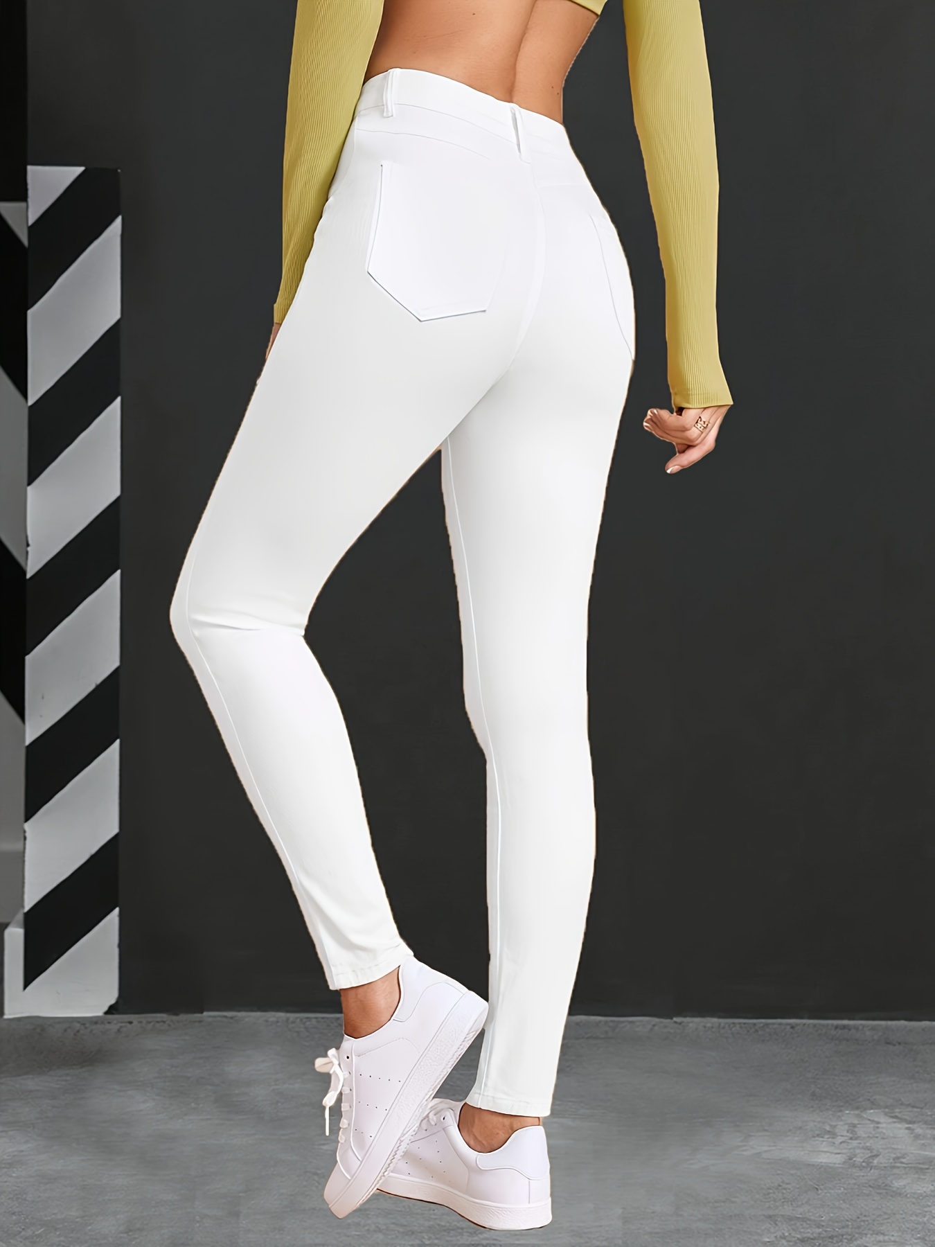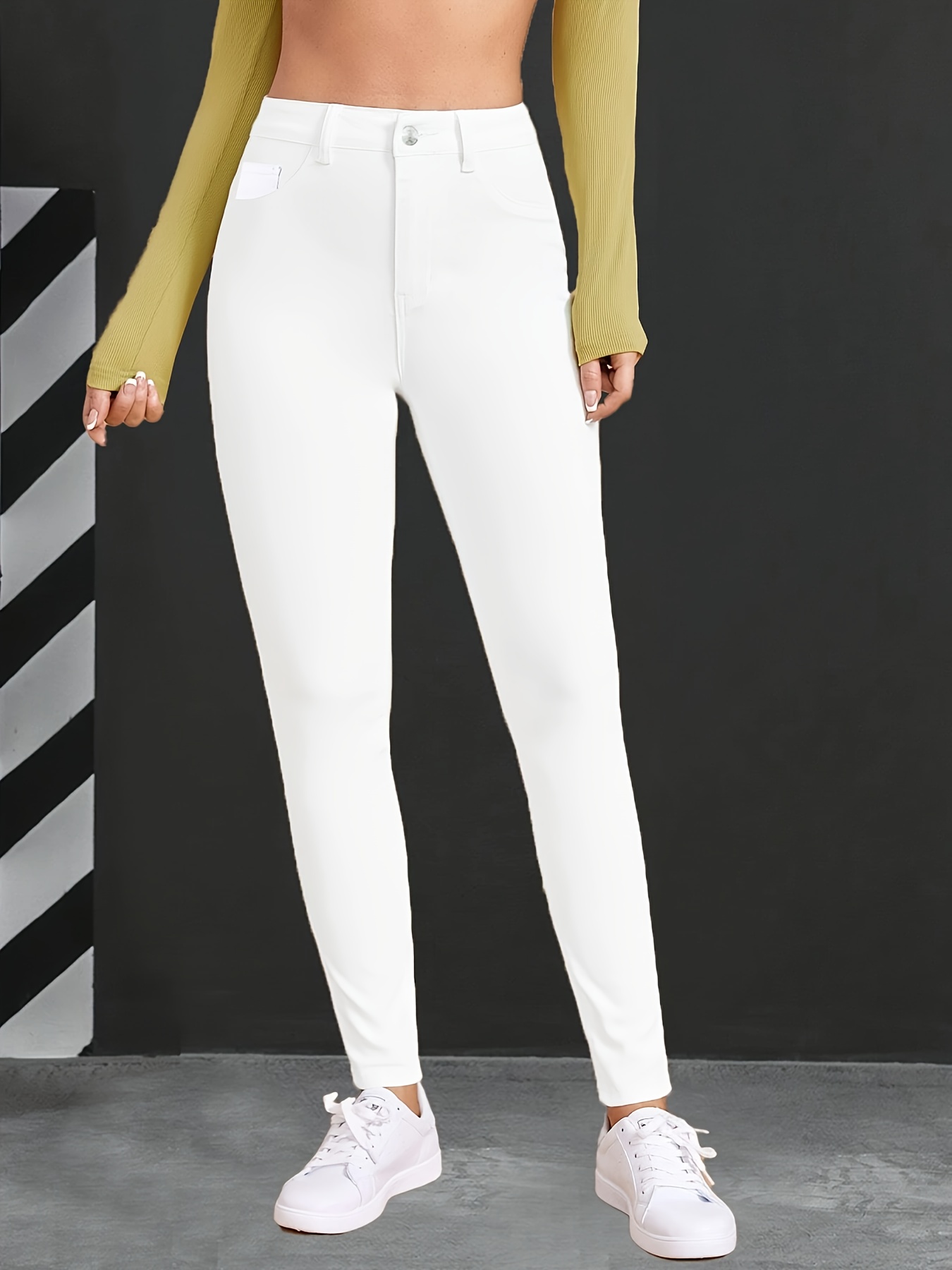 Women’s White High-Waisted Skinny Trousers – Stretch Ankle-Cuff Slim-Fit Pants with Button Closure, Solid Color Elegant Tailored Leggings for Casual & Formal Wear, All-Season Trousers (No )